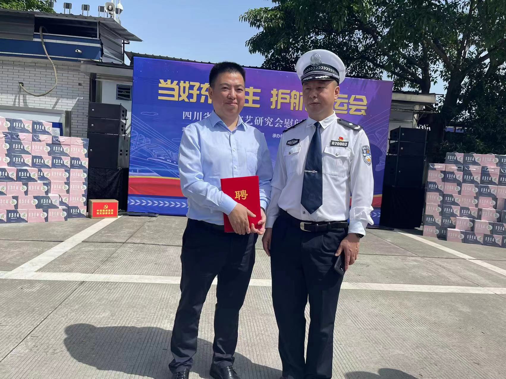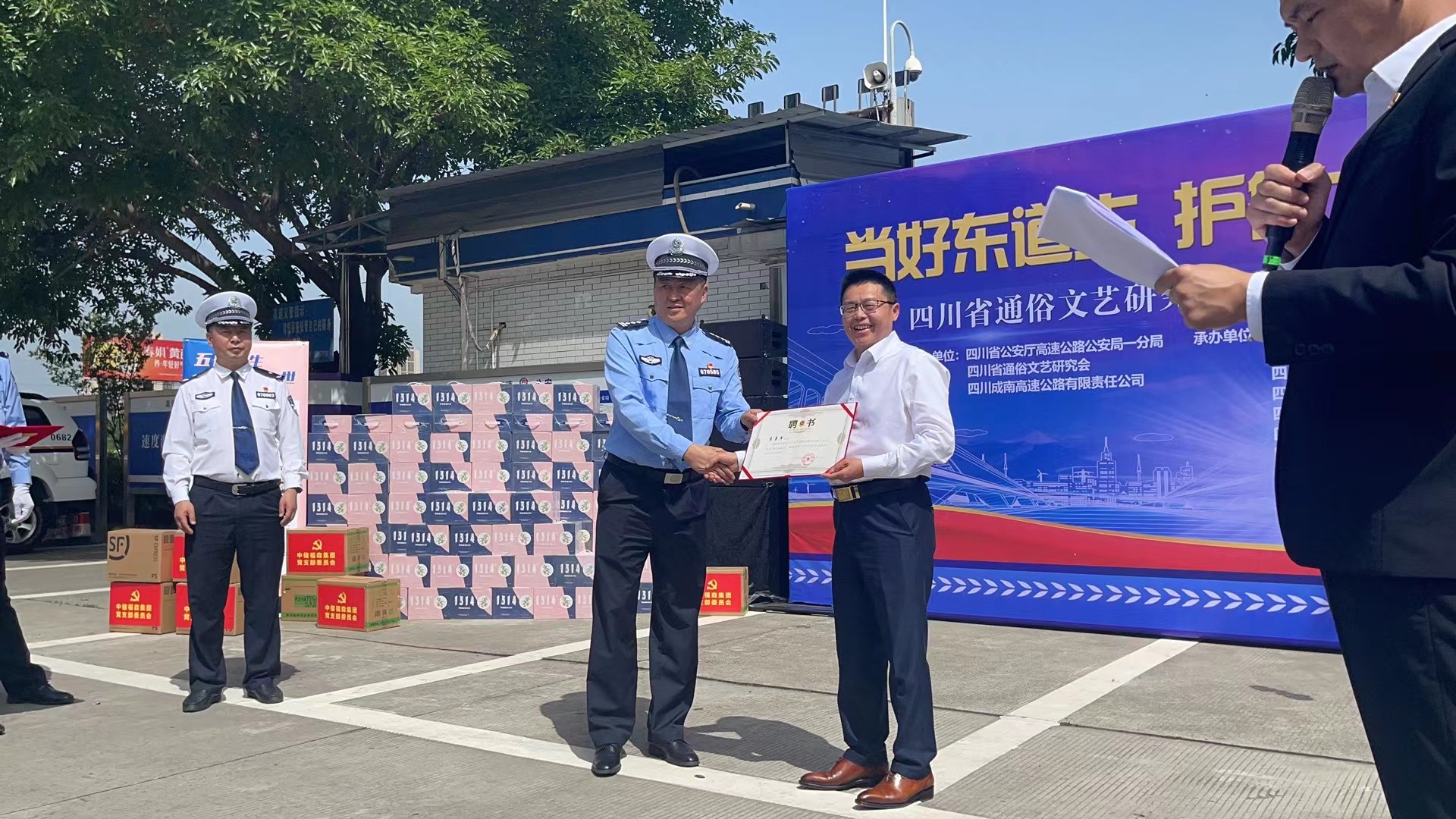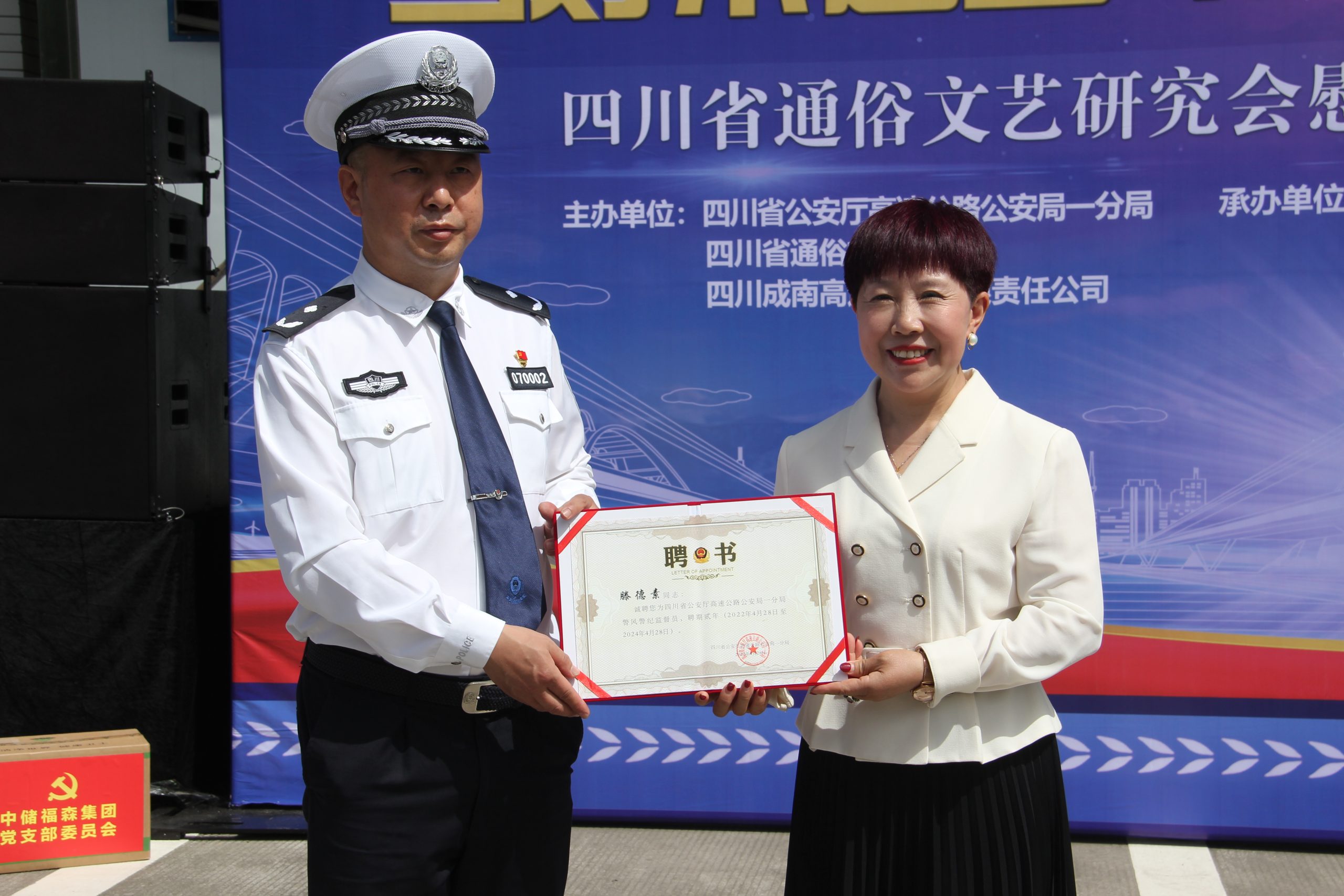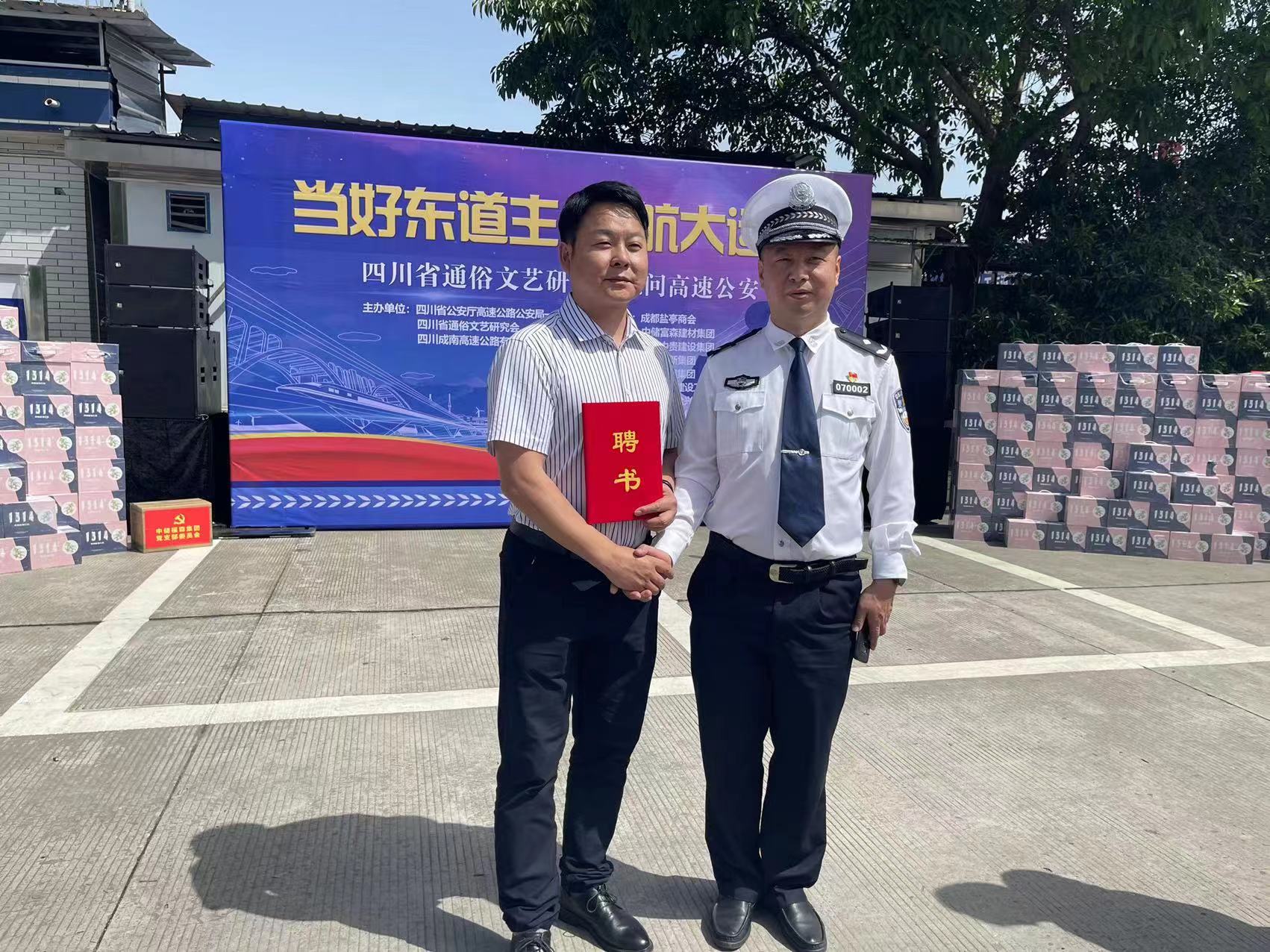 节目表演后,四川省通俗文艺研究会参与此次慰问活动的爱心企业家们为分局民辅警代表送上爱心物资。四川省公安厅高速公路公安局一分局政委徐晓松、副局长袁垅为爱心企业家、文艺工作者:陈家甫、杨新康、陈汶虎、滕德素、袁杰、李书伟、张美丽、袁勇军、江仕钧、潘伟、文静、汪思光、曾伟、陈勇、邓林分别颁发了“警风警纪监督员”、“交通安全宣传大使”聘书,并勉励文艺工作者通过文艺形式传播交通安全知识,倡导企业家积极履行社会责任,为社会主义经济建设贡献自己的力量,积极参与交通安全宣传的活动当中。