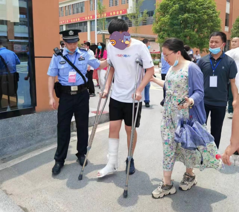 6月7日高考首日,新化县楚怡工业学校考点下午场考试刚结束,考生们依次有序走出考场,人群中一名脚部受伤拄着拐杖的考生缓缓而行,显得十分吃力。因考场不允许无关人员进入,正在考点执勤的上梅派出所执勤民警袁学林见状迅速上前搀扶,并一路护送其安全离开考点。