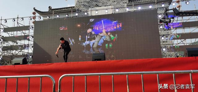 接下来是飞刀天武表演飞刀绝技。只见他用黑布蒙着双眼,在十步开外把利斧 ,钢刀飞向另外一名演员,刀刀惊险刺激。获得现场观众惊叫呐喊和热烈掌声。