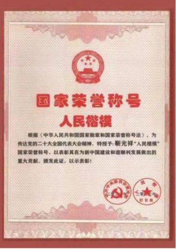 2019年,靳光祥荣获 “中医药亮剑成就人物”天下第一刀奖,并接受中央电视台等多家媒体采访时表示,致力于人类健康进步是他毕生的追求,将会发挥药食同源的优势及作用,为人类不能治愈疾病攻坚克难,为保障和改善民生健康做出自己应有的贡献。