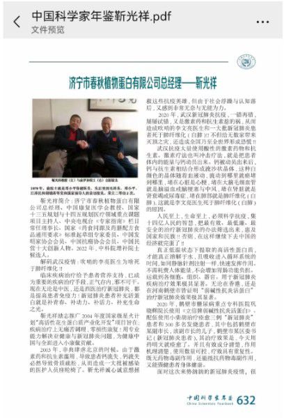 靳光祥简介;济宁市春秋植物蛋白有限公司总经理、中国康复医学会教授、国家十三五规划与十四五规划医疗领域重点课题项目主持人、中央电视台《专家指南》栏目常任理事长、国家《药食同源及药膳配方食品通用要求》标准起草组专家委员、中国发明家协会会员、中国抗癌协会会员、中国民营十大创新人物。2022年,中科院增补院士候选人。