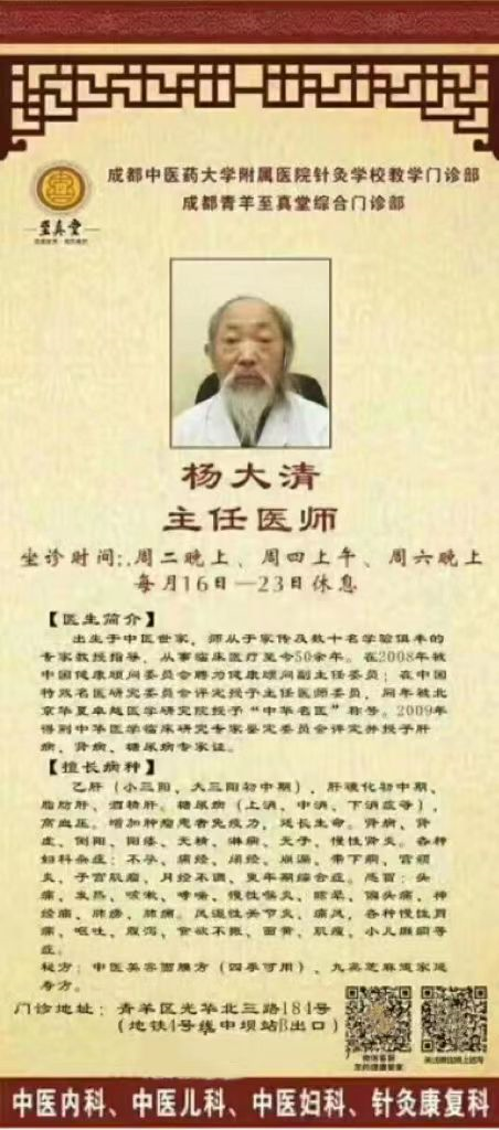 建党九十周年卫生事业功勋人物岐黄乙肝小中医主任医师国医大师杨大清行中医五十年,肝病,肾病,糖尿病,妇科科专家出生于中医世家,自幼师从于家传及数名学验俱丰的名老中医专家。从事中医临床50余年,先后医科杂志上发表学术论文数篇,在多家医学机构受聘或进行学术交流。临床善于诊治内科、妇科、男科、儿科各类常见病和疑难杂症,善于辩证,准确施治,方药独特,疗效佳。在2008年被中国医师网健康顾问委员会聘为健康顾问副主任委员;在中国名医研究委会评定授予;主任医师"委员.《全国医疗卫生改革与创新发展实用指导手册》中多次发表文章,并被中国医学创新发展史册收载。(书在中医古籍出版社发行),2008被北京华夏医学研究院授予“中华名医”。2009年得到中华医学临床研究专家鉴定委员会评定并授予肝病、肾病、糖尿病专家证,证书编号:200913110512712,并授于“中华教育论文编辑部记者证”,在中华医学临床研究特色专家栏中可查询。我在成都的中医大学至真堂,中医肿瘤医院,同康中医馆,德蓉堂,康民诊所,轮流坐诊。