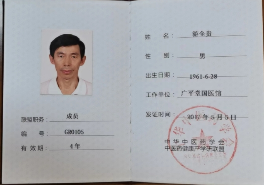 游全贵院长出生在世代医、易世家,中医执业医师;中医(疑难杂症)特色诊疗专家;自幼随父学习中医,是宋理学名家、教育家、易学大家程门立雪之游酢35代嫡孙,现任,“武夷山广平堂中医药发展有限公司法人代表”,杭州汤养元国医馆特聘中医专家,是中央国家机关老干部健康顾问专家组成员之一;全国中医疑难杂症科研实践示范基地负责人;积极参与国家发改委营养项目办的公益活动,是大健康联盟巡讲团高级讲师;全国疑难病防治管理中心主任专家委员;《国医网》顾问委员会主任专家委员;全国养生保健指导中心副主任专家委员;国家卫生部人事部评定(医疗行业)高级技术职称;国际注册特色诊疗执业医师;获2008年度首届医药卫生界“十大医德楷模人物”称号;并获国家邮政总局(中南海邮局)《健康顾问》嘉宾专题邮票,全球邮政系统公开发行;有深厚的中医理论基础与临床经、并深得祖辈传承独特的子午流注针法、创新高效的针、药结合及中药微生态疗法,已为数万例饱受心脑血管、各类癌症、白血病、强直性脊柱炎、脑溢血、股骨头坏死、乙肝、月子病、痔疮、骨病、胃病、糖尿病、肝硬化腹水、三高症、血栓中风、心脏病等急慢性疑难杂症之苦的病人解除病痛。由于疗效显著,治愈率高,众口皆碑。有远至海外十几个国家的患者,以及全国(北京、河北、内蒙、云、贵、川、山东、安徽、福建、江西、广东…等地)均有众多患者慕名而至并几获治愈,深受患者好评。是游氏子午流注针灸刺络系列针法的传承人和创新者,擅长中医(疑难杂症)特色诊疗、擅长大周天全息脉的脉诊方法,准确率几乎达99%。