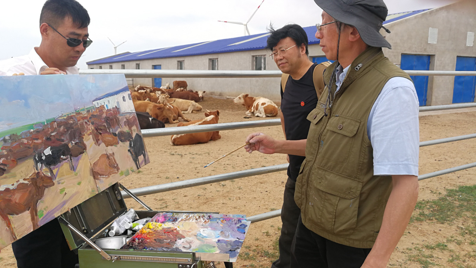这次一行9位画家各有专长,既有油画、水彩,又有国画山水、人物,这就给接待方选点布阵带来一定的困难。区政协采取在确定大的景点的同时,再配以在农户访问的写生穿插,甚至派车带着模特到草原一起写生的做法,使每位画家都能找到素材、发挥专长。范迪安、覃志刚、徐里以油画、水彩见长,在变幻多端的云天、广袤无际的草原以及牛棚羊群、湖泊、白桦林边更能发挥色彩的特点,产生了一幅幅动人画面;许钦松、刘万鸣是画山水、花鸟,以及雕塑家吴为山,也在蒙古族的各个生动形象感动下画起了人物写生;尼玛泽仁、唐勇力、孔维克本就是人物画家,面对二连浩特边防战士、乌兰牧骑演员及蒙古大娘额吉和小姑娘呼亨、小伙子扎鲁,还有那些摔跤手、牧马人,更是得心应手,画出了一系列精彩的写生作品。