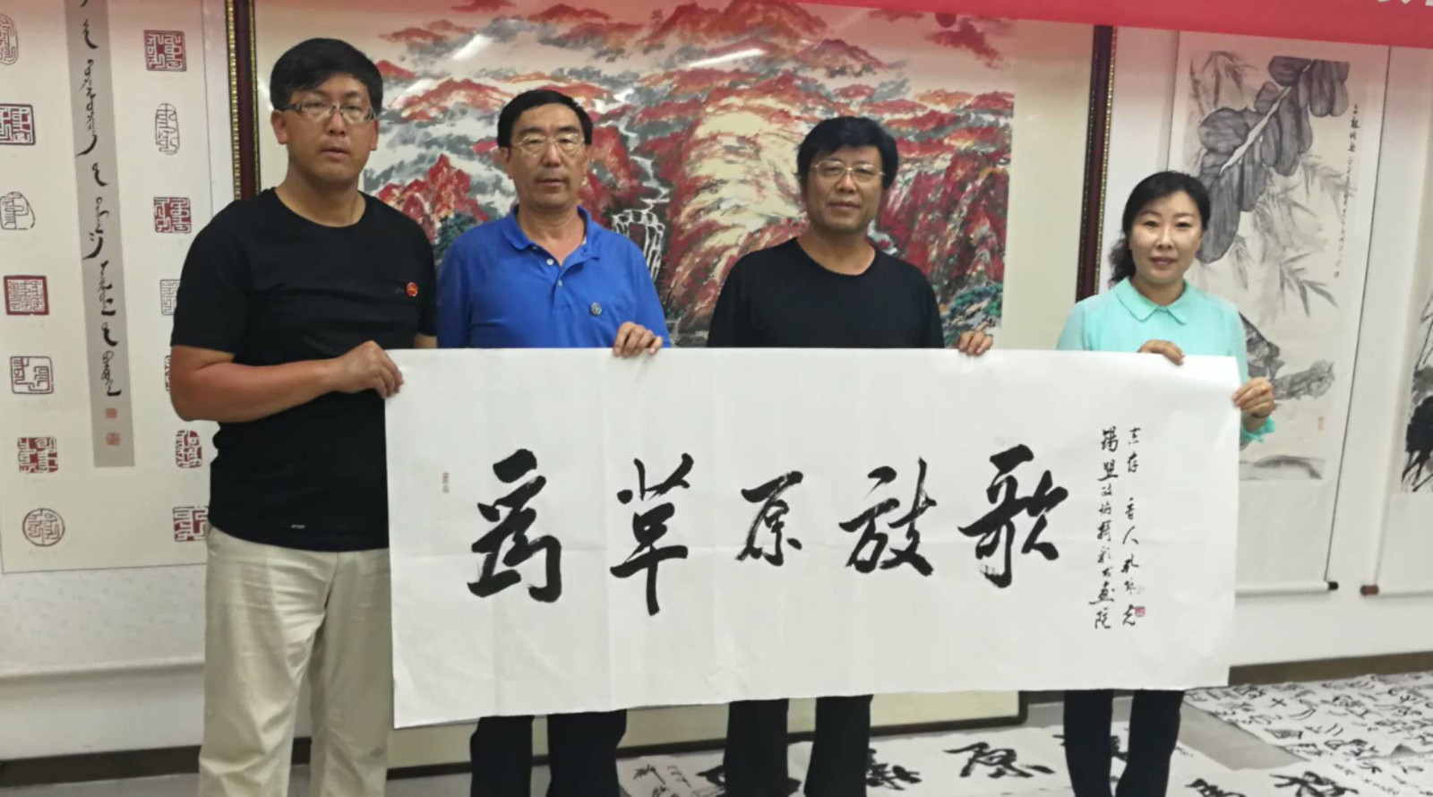 与当地书画家及牧民交流、送文化下基层