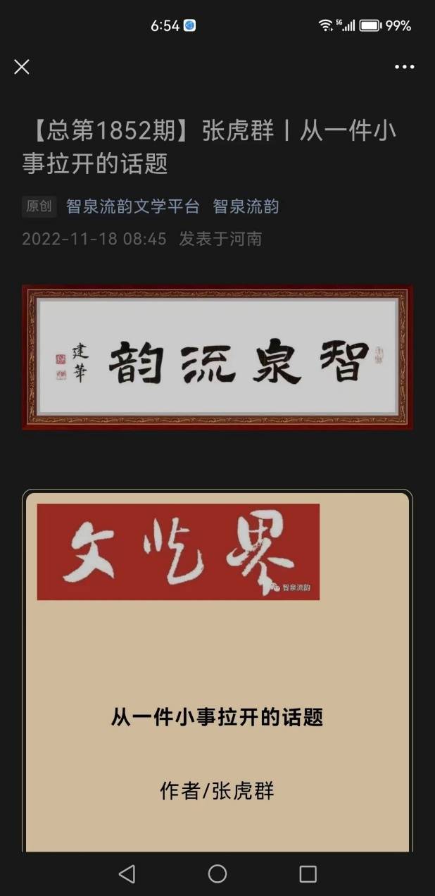 郭氏父子对我的书法作品情有独钟,邀请我题写了《智泉流韵》文学平台刊名并一直使用至今。《智泉流韵》文学平台对我的作品发表大开绿灯。我的系列诗书双创作品成为《智泉流韵》的常客。经我组稿,由我担任顾问的玉山县作协和永修县作协均在《智泉流韵》发表了一批作家的作品专刊。