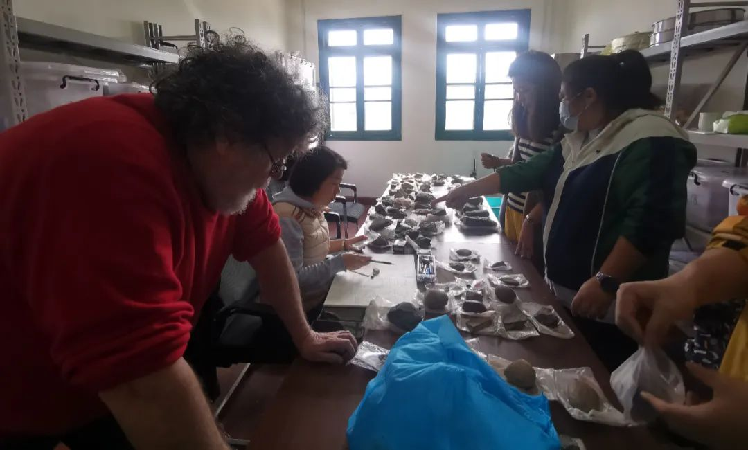法国巴黎第十大学Eric Boëda教授、武汉大学历史学院考古系主任李英华教授到临沧市文物管理所查看农克硝洞遗址考古发掘出土石器 临沧市委宣传部 供图