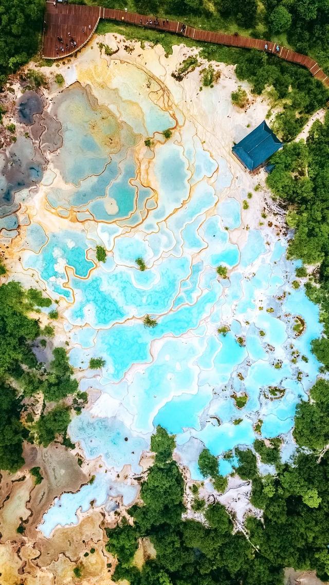 与九寨沟相邻的黄龙景区,有一处最与众不同的蓝。海拔3900米的五彩池,是黄龙最上端的钙华彩池群,数百个池子蓝绿不一,色彩各异,在郁郁葱葱的丛林掩映下,更显得晶莹美丽。