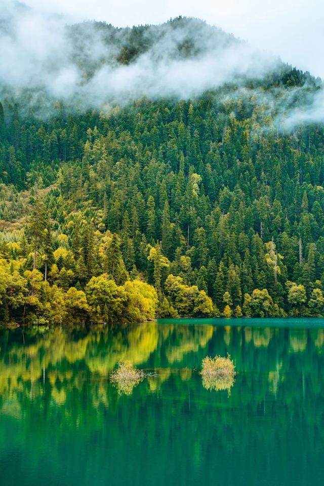 在这里,错落有致的湖泊群如同宝石般熠熠生辉,映着雪山、森林、白云,水天一色,波平如镜。九寨沟的镜海出水口是一道宽谷,在宽谷中形成了诺日朗群海。